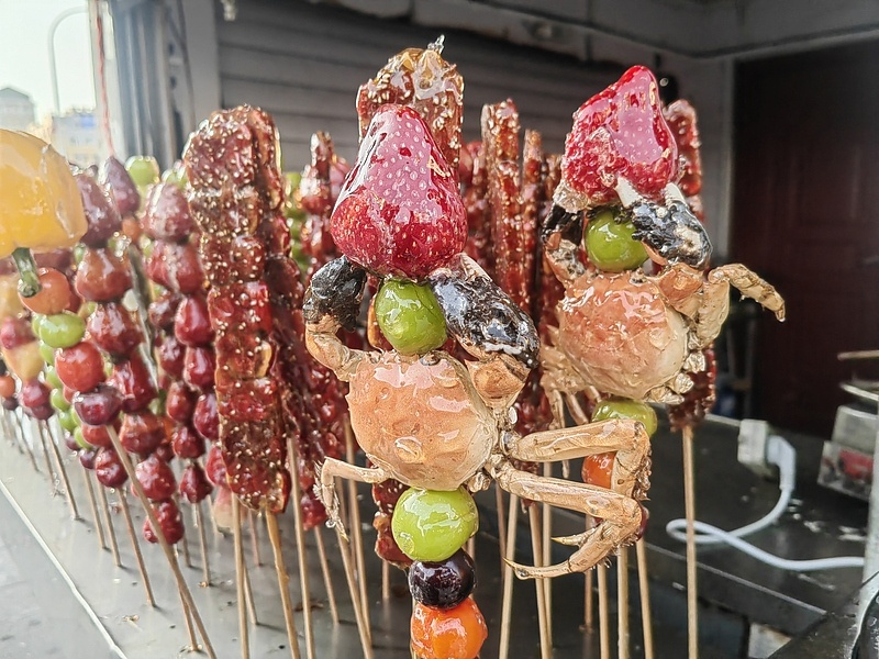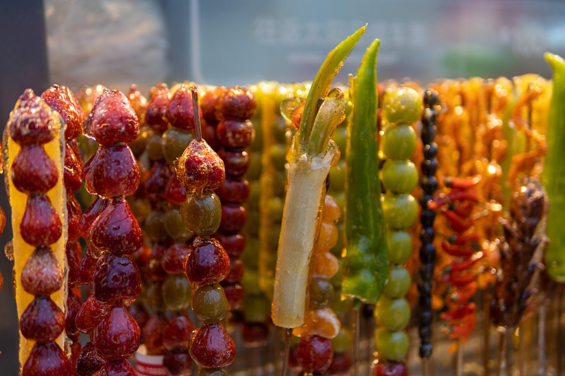 如今,除了常见的山楂果、草莓等原料,冰糖葫芦还卖出新花样。在东北这个“天然大冰箱”,更是“万物皆可冰糖葫芦”。